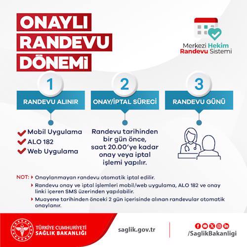 Ulusal Sağlık Değerlendirme ve Koordinasyon Toplantısı’nda konuşan Sağlık Bakanı Fahrettin Koca, Merkezi Hekim Randevu Sistemi’nde yeniliğe gidildiğini açıklayarak, 13 Mayıs 2024 tarihinden itibaren Onaylı Randevu Dönemi’ni başlattı. Koca, sistemi tanıtırken yaptığı açıklamada, bir yıl içerisinde “23 milyon kişinin aldığı randevulardan en az birisine gelmedi”ğini belirterek, randevuya gelinmeyen toplam sayının nüfusun yaklaşık dörtte birisine ulaştığının altını çizdi. Koca’ya göre “randevu sadakatsizliği” nedeniyle halen kapasitenin %30’u kullanılamamakta.[1]