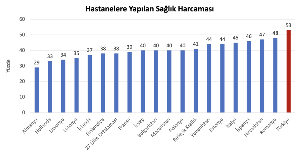 Bir ülkenin sağlık sistemi analiz edilirken sadece o ülkenin zaman içerisindeki değişimini göz önüne almak yeterli değildir. Aksine diğer ülkeler ile kıyaslamalı analiz yapmak ülkelerin sağlık sistemleri arasındaki farkları görmeyi sağlayarak sağlık sistemlerini iyileştirmeye katkı sunar. Bu bağlamda Türkiye’nin hastane temelli sağlık hizmet yapısının OECD ülkeleri ile kıyaslanması ülkemizdeki çarpıklığı göstermesi açısından dikkate değerdir: Veriler, Türkiye’nin sağlığa harcadığı her 100 birim paranın 53 birimini hastanelere harcadığını, oysa Türkiye ile benzer nüfusa sahip Almanya’da bu miktarın 29 birim olduğunu göstermektedir.[3]