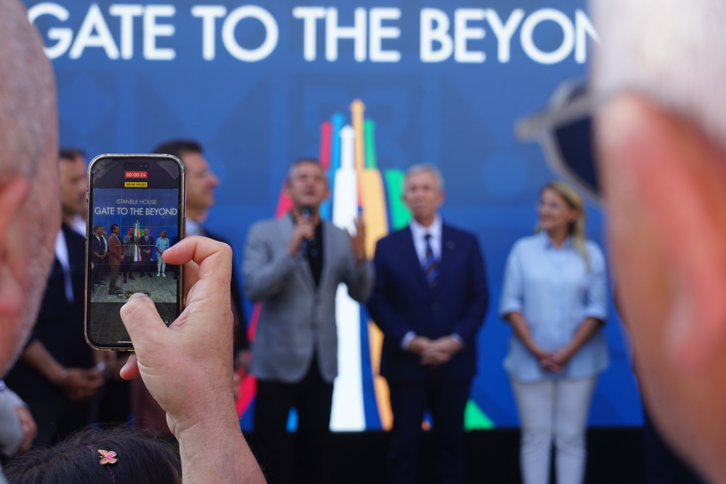İstanbul Evi'nin son günü olan 8 Ağustos'taki etkinliğe benim de katılma fırsatım oldu. Dev ekran önünde toplanmış hatırı sayılır bir kalabalık vardı; birkaç kişinin ellerinde Türk bayrakları, üzerlerinde Türkiye temalı kıyafetler ve kimilerin üzerinde de Atatürk simgeli aksesuarlar göze çarpıyordu. Etkinliğe ilginin yoğun olacağı, 9 numaralı metroya bindiğimde Türkçe konuşan, bayraklı yolcuların sayısındaki artıştan anlaşılıyordu. Sarayın görkemli bahçesinden geçip etkinliğin merkezine, avluya doğru ilerledik. Burada katılımcılara su ve limonata ikram ediliyordu. Alana giriş yaptıktan 15 dakika sonra, başta İmamoğlu olmak üzere olayın diğer aktörleri tek tek söz almaya başladı.