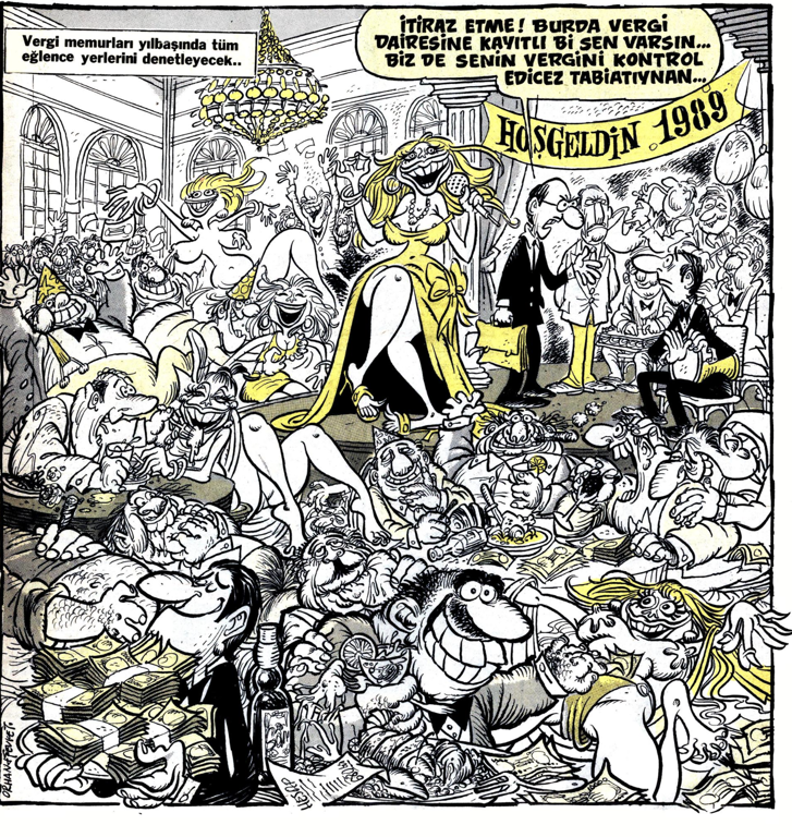 Karikatürler, yeni yılı kutlayanları sınıfsal bir ötekiye cinsiyetçi bir dille ittiriveriyor kuşkusuz. Diğer yandan karikatürlerde yeni yıl kutlamalarını dışlamayan, buna dahil olamamayı dert eden bir yol da takip edilebiliyor. Örneğin ilk karikatürde sınır net ve yeni yıla katılamıyoruz, ikincisinde sahnenin kurucusu rolündeyiz, üçüncüsün de ise dahil olmanın bir yolunu buluyoruz. Ama sonuçta kutlamanın nasıl yapılacağını henüz bilemiyoruz. Bu belirsizlikten çıkış sonraki yıllarda kutlama arayışının keskin bir şekilde akamete uğratılmasıyla nihayete erecek. Kutlayamıyorsak kutlamayalım. Karikatürlerde sunulan cinsellik, tüketimcilik, karışan uzuvlar ve salgılar belirli bir sınıfın göstergesinden genel ahlakın kendini kurduğu karşıt gösterene yerleşecek. Dergilerin aslında sınıfsal göstergeler olarak sunduklarının, ahlaki düzleme kolaylıkla taşınabilir olduğunu da maharetli siyasetçiler gösterecek kuşkusuz. Aslında buradaki ilgisiz ama ideolojik sonuçları olacak göstergesel eklemeleri ayırt etmek gerekiyor. Cinsiyetçi tacizler içkiyle, yemekler şişmanlıkla, eğlence saldırganlıkla, yoksulluk darbukayla, yılbaşı ağacı uzuv (ayak), yemek artıkları ve yine içkiyle bir araya geliyor. Dolayısıyla mesele, sanki eleştiri yaparken çeşitli ihlaller gerçekleştirmekten daha fazlası.