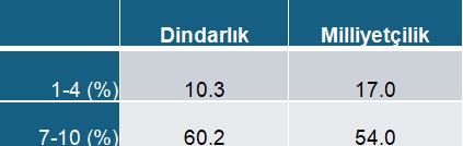 Düşünüldüğünün aksine gençler arasında dindar pratikler azalmış olsa da dindarlık çözülmüş değil. Dindarlık düzeyine 10 üzerinden 7 ve üzeri verenler %60.2. Tersine dindar olmayanlar (1-4 verenler ise) sadece %10.3.