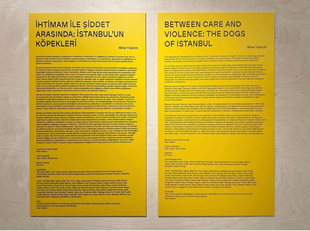 16 Nisan’dan bu yana sürmekte olan, küratörlüğünü Joanna Zielińska’nın üstlendiği “Hayvanların Yaşamı” sergisi kapsamında, Dr. Mine Yıldırım tarafından hazırlanan “İhtimam ile Şiddet Arasında: İstanbul’un Köpekleri” başlıklı arşiv ve araştırma sergisi 10 Ağustos 2025’e kadar Salt Beyoğlu’nda görülebilir.