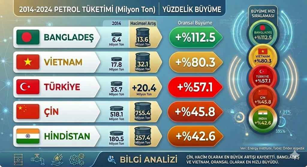 2014-2024 arası petrol tüketimini oransal olarak arttıran ilk beş ülke.