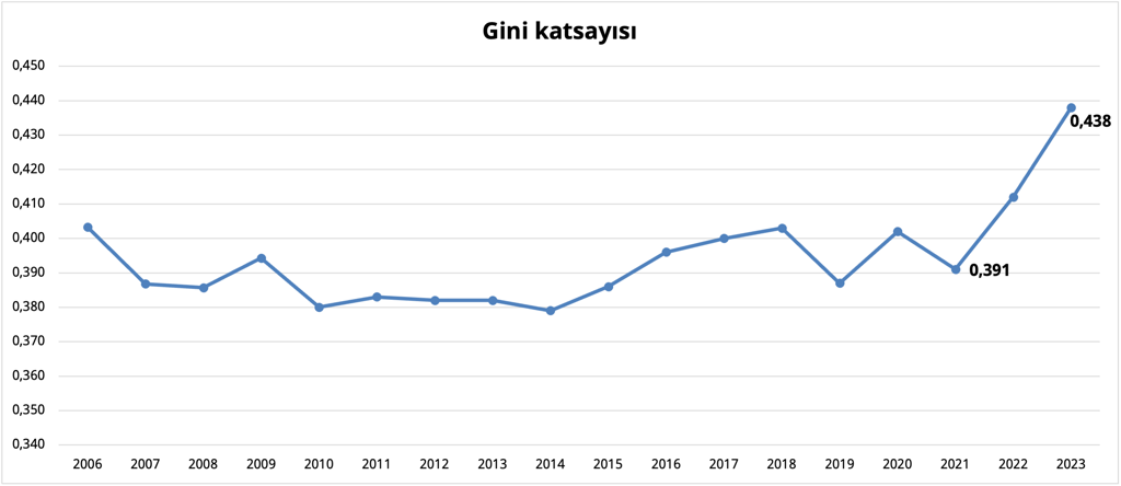 Aşağıdaki grafikte 2006-2023 yılları arasındaki Gini katsayısının yıllara göre dağılımı görülüyor. TÜİK verilerine göre, 2006-2014 yıllar arasında gelir dağılımında iyileşme sağlanırken 2015 yılında eğilim değişiyor. 2018-2020 yılları arasında yaşanan kısmi dalgalanma sonrasında 2021 yılıyla beraber dramatik bir artış meydana geliyor.