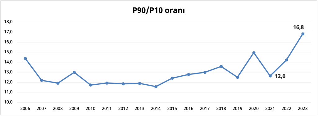 Son olarak, P90/P10 göstergesi en zengin %10’luk grubun geliri en yoksul %10’luk grubun gelirine oranlanarak hesaplanıyor. Toplumun 100 kişiden oluştuğunu varsaydığımızda en zengin 10 kişiyle en yoksul 10 kişinin toplam gelirlerinin oranında yaşanan artış daha dramatik. 2021-2023 yılları arasında P80/P20 yaklaşık olarak %29,58 oranında artarken, P90/P10 yaklaşık olarak %33,33 oranında artıyor.