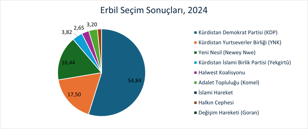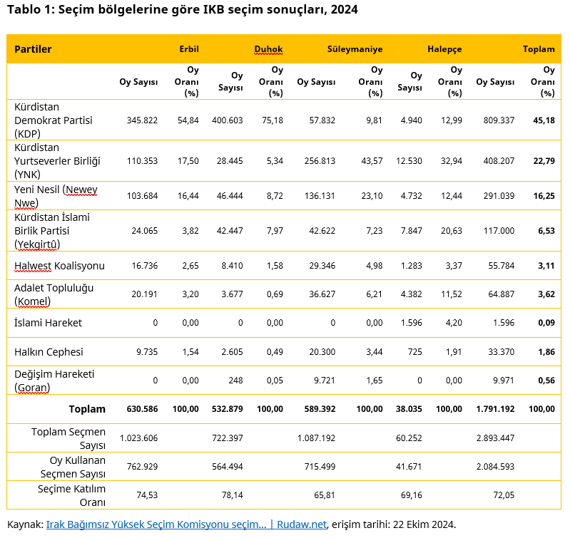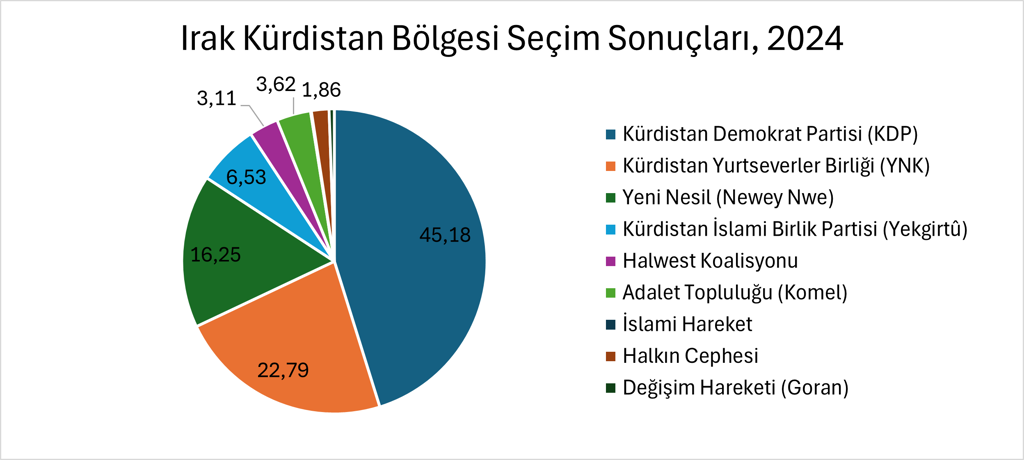 Seçimlerin gösterdiği ikinci önemli husus KDP’nin devam eden hakimiyeti. IKB genelinde 2013 seçimlerinde[2] %38,15; 2018 seçimlerinde[3] %44,13 oy alan KDP, 2024 seçimlerinde %45,18 oy aldı.