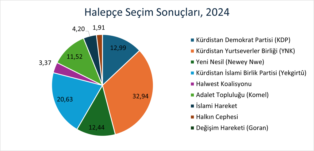 Buna karşın en yakın rakibi olan YNK, 2013 seçimlerinde %17,80, 2018 seçimlerinde %20,48 oy alırken, 2024 seçimlerinde %22,79 oy aldı.