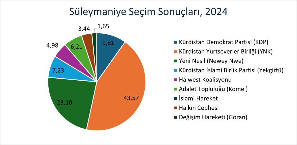 Yeni Nesil Hareketi’nin istikrarlı yükselişi, Kürdistan’daki değişim arayışının sürdüğünü gösteriyor. 2017 yılında liberal bir parti olarak Şaswar Ebdulwahîd tarafından kurulan Yeni Nesil Hareketi 2018 seçimlerinde %8,15 oy aldı. Bu oylar esas olarak Goran’dan geldi. Goran’ın marjinalleştiği 2024 seçimlerinde Yeni Nesil Hareketi oylarını %16,25’e çıkardı.