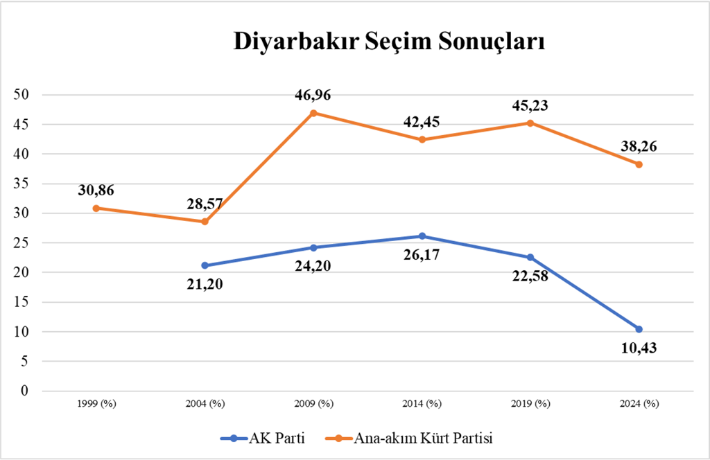 Hem DEM Parti geleneğinin hem de AK Parti’nin Kürt alanındaki sırasıyla 1999 ve 2002 sonrasındaki seçim performanslarını daha önce Birikim sayfalarında ele aldım. Aşağıdaki grafikte detayları görüldüğü üzere, Diyarbakır örneği üzerinden baktığımızda 2002 yılındaki seçimlerde oy kullanma hakkı olan her 100 seçmenden 49,8’i ya ana-akım Kürt partisine ya da AK Parti’ye oy verdi. Bu rakam 2009 seçimlerinde 71,2; 2014 seçimlerinde 68,6; 2019 seçimlerinde ise 67,8 olarak gerçekleşti. Özetle, 2009-2019 dönemi Kürt itirazının en canlı olduğu yıllardı.