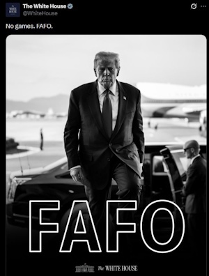 Birinci karede, Başkan Trump çok ciddi ve kararlı biçimde bir yere yürüyor. “No Games. FAFO” denmiş. Yani “fuck around and find out”. Beyaz Saray editi mi desek? Kaşınma, kaşırız diye kibarlaştırabiliriz, ama adlı adınca şakamız yok, adamı bilmem ne yaparlar demeye getirmişler.