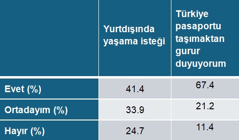 Gençler arasında Türkiye’ye aidiyet oldukça güçlü olmasına rağmen yaygın olarak aidiyetin zayıfladığı düşünülüyor. Birçok araştırmadan ve sokak röportajlarından yola çıkarak dolaşımda olan bir bilgi şu: gençler yurtdışında yaşamak istiyor. Bunu isteyen genç oranının yüksek olduğu doğru ama gözden kaçan iki şey var. Birincisi istemeyen de az değil, ikincisi yurtdışına gitme motivasyonları çeşitleniyor. En önemlisi, yurtdışı, Türkiye’de imkânı kalmadığı düşünülen ekonomik statü atlama fırsatı olarak görülüyor. Farklı yerler görme, farklı kültürler tanıma motivasyonu da var. Elbette kimisi için de bir kaçış niteliğinde. Ancak yurtdışında yaşama isteği tek başına kaçış arzusunun göstergesi değil. Mevzu bahis araştırmamızda biz de gençlere “imkanınız olsa yurtdışında yaşamak ister miydiniz” şeklinde bir soru yönelttik. %41,4 buna evet dedi. Geri kalanların azımsanmayacak sayıda olduğu bir yana, bu oran aslında geçmişe göre düşme eğilimine işaret ettiği için de ilginç. Yaptığımız odak grup toplantılarında da yurtdışına gitme motivasyonlarında tereddüt emarelerine rastladık. Zira güvensizlik hissi sadece Türkiye ile sınırlı değil. Özellikle Trump vakası ve sağ popülist liderlerin yükselişi, gençleri kaygılandırmış. Hiç olmazsa Türkiye’de bir ailem var duygusu var. Türkiye’yi terk etmeme duygusu da bunlara eşlik ediyor. Türkiye pasaportunu taşımaktan gurur duyma oranı %67.4. Dolayısıyla yurtdışında yaşama eğilimleri olsa dahi güçlü bir Türkiye aidiyeti var. Son yıllarda artan bir ‘bu topraklar’ anlatısı, reklamlara, sanatçı demeçlerine, siyasetçi konuşmalarına, köşe yazılarına sirayet etmiş durumda. Irkçılık yapmayarak milliyetçilik yapma sanatı olarak, bu toprakların ve dolayısıyla sahipleri olan Türklerin başka yerlere (tabii ki esasen de Batı’ya) göre manevi ve ahlaki üstünlüklerine gönderme yapıyor.