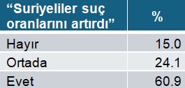 Kürtlerin, bu toprakların evladı olarak görülmeye başlaması ve yerli ve milli ötekiler haline dönüşmesi ile en popüler karşıtlıkta Suriyeliler üst sıraya yükselmiş. Neredeyse toplumun her kesiminde Suriyelilere yönelik nefret duyguları ön planda. Bu konudaki dolaşımdaki tüm rivayetler ve yanlış bilgiler gerçeklik olarak algılara yerleşiyor. Örneğin, istatistiklerin Suriyelilerin Türkiye genelindeki suç oranlarından daha az suç işlediğini göstermesine karşın, onları potansiyel suçlu görme davranışı yaygın. Hatta sembolik değeri daha yüksek yüz kızartıcı suçlara yakıştırmalar oldukça yaygın. Suriyeliler suç oranlarını artırdığı önermesine evet diyenler, gençler arasında %60,9.
