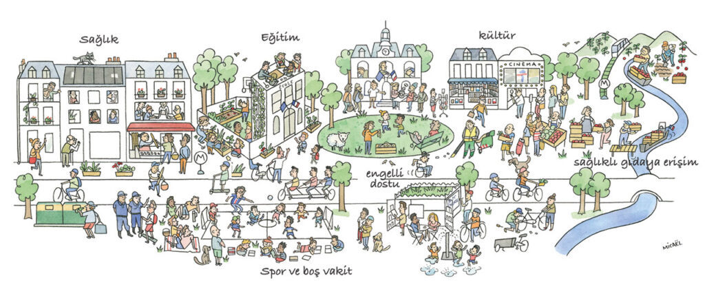 Bu ideal, Paris Belediye Başkanı Anne Hidalgo’nun 2020 seçim kampanyasında “la ville du quart d’heure” (çeyrek saatlik şehir) vizyonuyla somutlaştı. Hidalgo, her semti kendi kendine yetebilen, yürünebilir komşuluk birimlerine dönüştürmeyi ve böylece hem kirliliği ve stresi azaltmayı hem de kentin sosyal dokusunu yeniden güçlendirmeyi hedefledi (The Guardian, 2020). Paris’in sokaklarında, okul bahçelerinde ve bisiklet akslarında görülen bu dönüşümle birlikte “15 dakikalık kent” vizyonu, sürdürülebilirlik, refah ve iklim dostu yaşamın yeni parolası haline geldi (Gongadze ve Maassen, 2023).